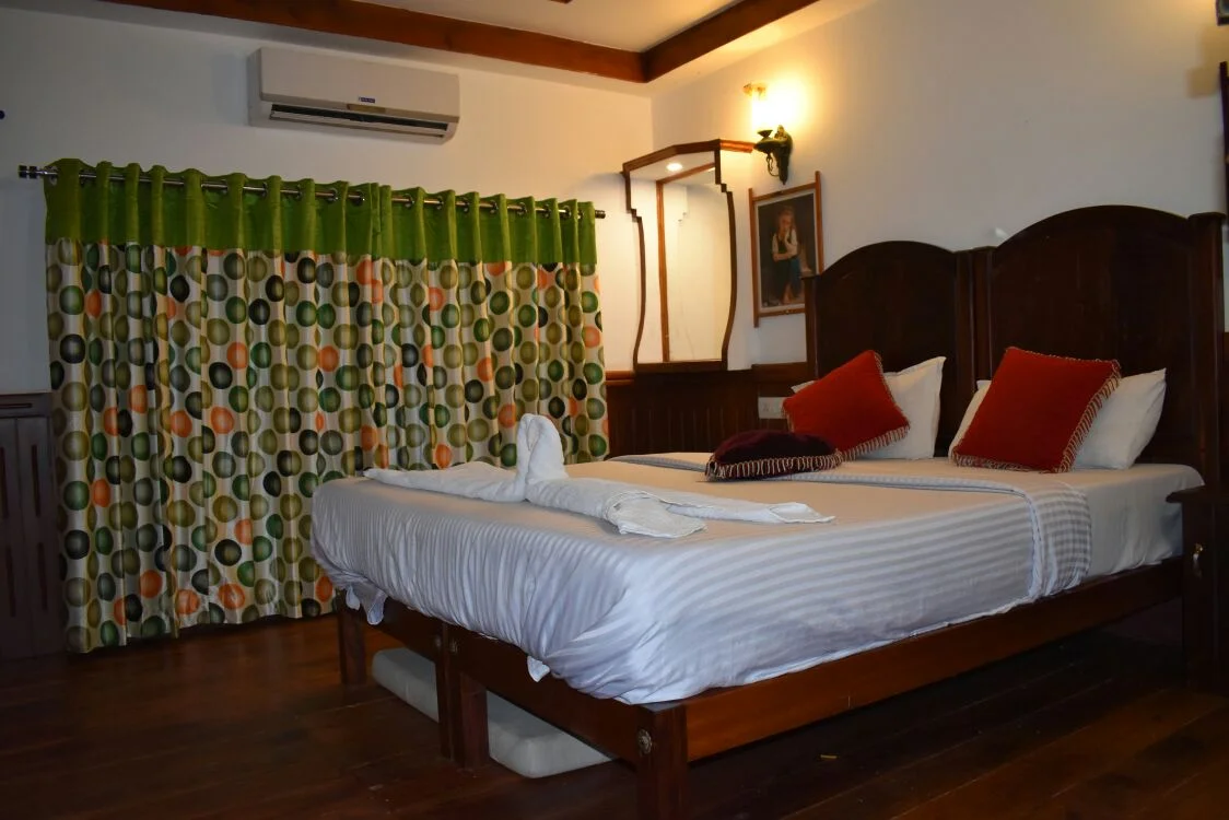 The backwaters of Kumarakom form the perfect stage for this tranquil escape. As the houseboat cruises through calm waters, you are treated to a panorama of lush green paddy fields, coconut palms swaying in the breeze, and flocks of birds dotting the sky. Life along the banks moves at its own unhurried rhythm – fishermen casting nets, children waving from the shore, women washing clothes at the water’s edge. It is a living portrait of rural Kerala, unspoiled and deeply rooted in tradition.