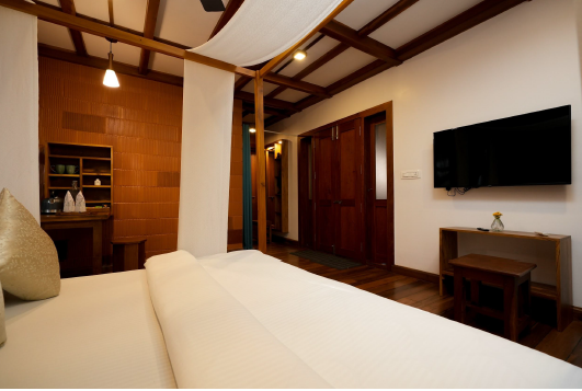 Our place is super cozy and has a room with a bathroom attached, a chill patio, and a small but beautiful garden right by the banks of a canal in Kumarakom. And, if you’re looking for some excitement, we’ve got options for canoeing, kayaking, fishing, and experiencing the local vibe, all for an additional cost. We want you to connect with the locals and get a taste of the local culture. In our kitchen, we cook up some seriously delicious local dishes and even host cooking classes for those who want to get in on the action. We’re all about introducing you to the authentic flavours of Kerala cuisine, and we’re pumped to hear about the traditions and eats from your place too!